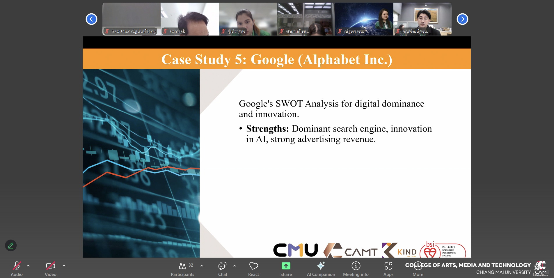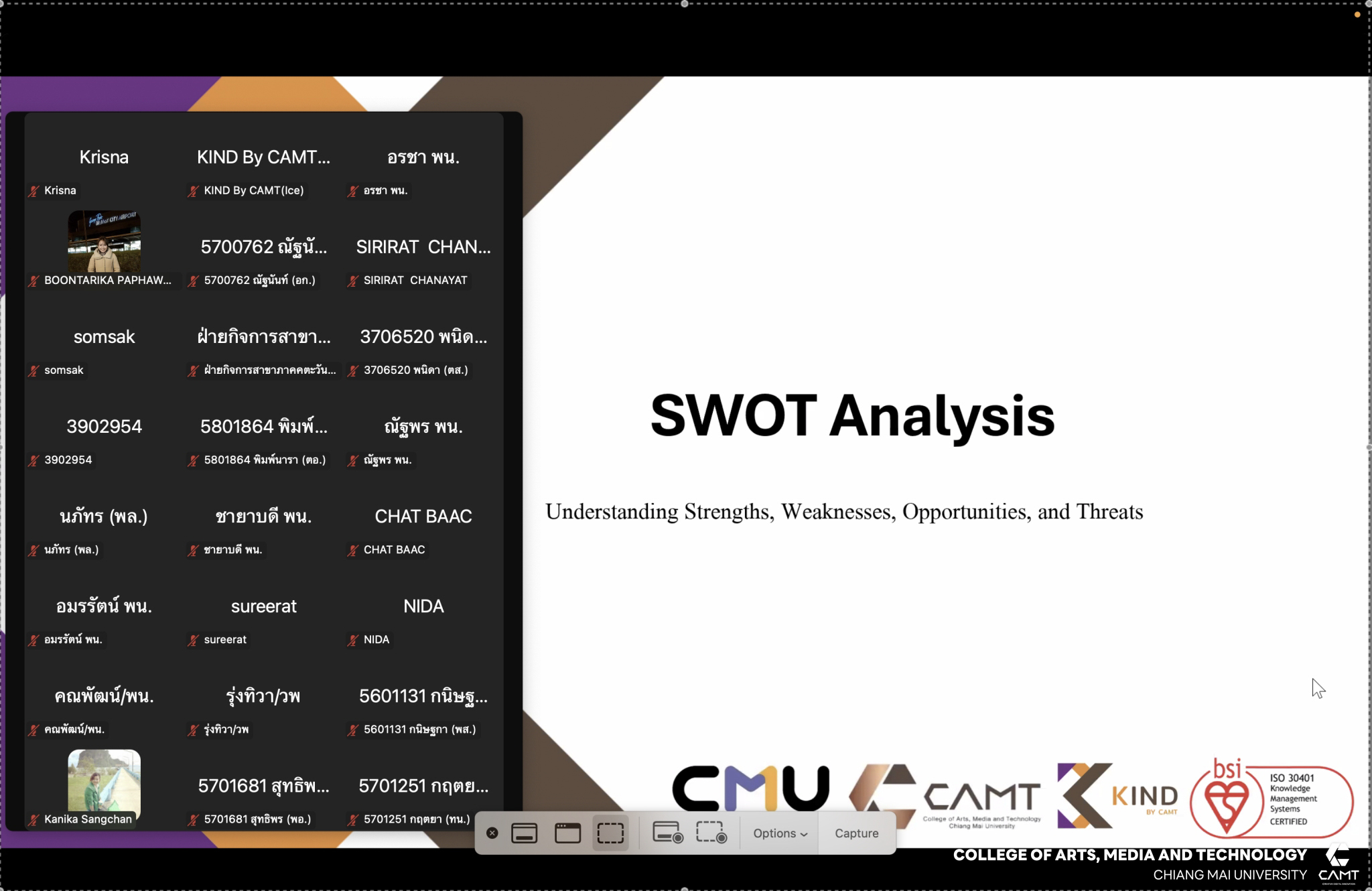 ศูนย์การพัฒนาองค์ความรู้และการจัดการนวัตกรรม (Knowledge and Innovation Development: KIND) วิทยาลัยศิลปะ สื่อ และเทคโนโลยี มหาวิทยาลัยเชียงใหม่ ร่วมกับ ธนาคารเพื่อการเกษตรและสหกรณ์การเกษตร (ธ.ก.ส) โดยมีผู้ช่วยศาสตราจารย์ ดร.บุณฑริกกา ปภาวสิทธิ์ เป็นวิทยากรบรรยายกิจกรรมการฝึกอบรมเชิงปฏิบัติการ เรื่อง การวิเคราะห์องค์กรและการวิเคราะห์ความเสี่ยงขององค์กร (ครั้งที่ 1) ในหัวข้อ “วิเคราะห์บริบทองค์กร โดยการทำ SWOT Analysis และ Stakeholder Analysis” โดยระบบออนไลน์ ให้แก่ผู้บริหารและบุคลากรตัวแทนจากส่วนงานที่ร่วมขับเคลื่อนการจัดการความรู้ขององค์กร ทั้งจากฝ่ายกิจการสาขาภาค และสำนักงานใหญ่ เพื่อพัฒนาความรู้และเตรียมพร้อมพัฒนาระบบฯ สู่การรับรองมาตรฐาน ISO 30401 : 2018 มีผู้เข้าร่วมจำนวนทั้งหมด 33 ท่าน ในวันพุธที่ 27 สิงหาคม 2568 ณ วิทยาละยศิลปะ สื่อ และเทคโนโลยี
